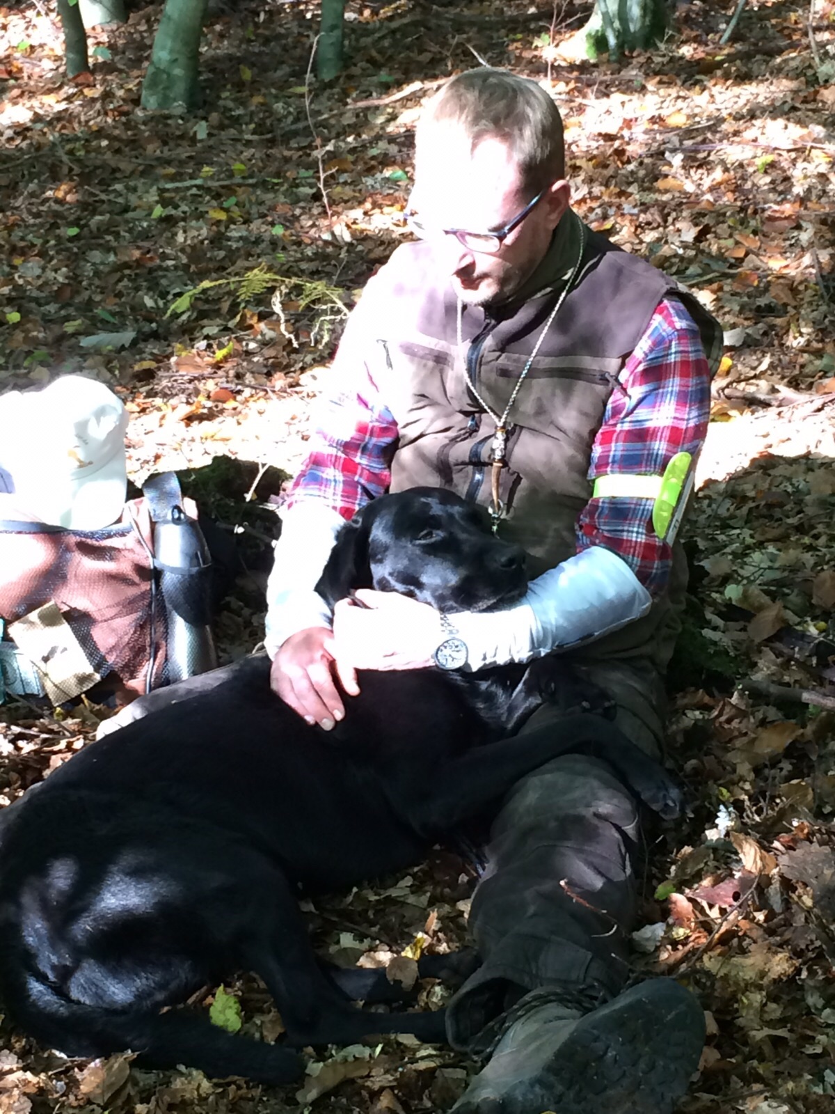 2 Teams stehen neben der Richterin im Wald. Walk up durch den Wald. Dann Stopp. Vor uns viel Totholz. Es wird abwechselnd gearbeitet. Pino hat fantastisch gearbeitet. Das haben wir mit ihm echt toll hinbekommen. Nase ganz tief am Boden und ein schwieriges Dummy unter einem am Boden liegenden Stamm herausgeholt. Dann war das andere Team dran. Dann Walkup weiter in eine andere Richtung im Wald. Wieder Stopp. Etwas tiefer als vorher ein weiteres Suchengebiet – wieder mit viel Totholz. Auch hier hat Pino fantastisch gearbeitet. Kommentar der Richterin. Mit uns (beiden Teams) geht sie gerne jagen – besser geht es nicht.